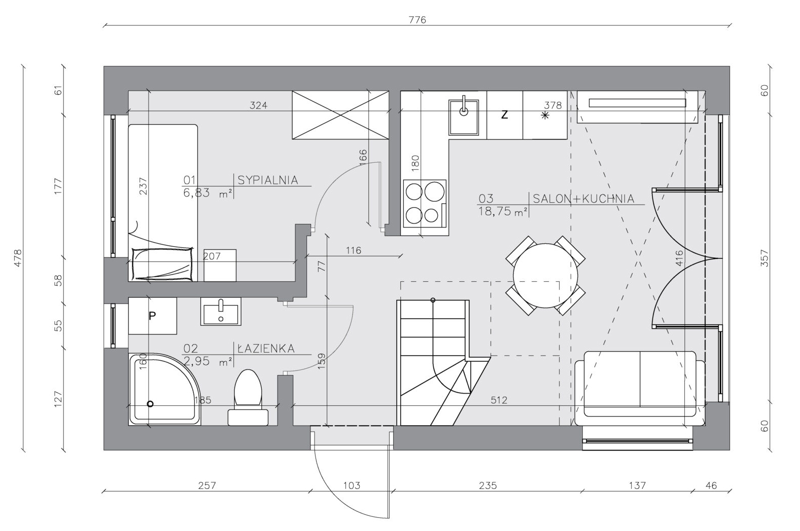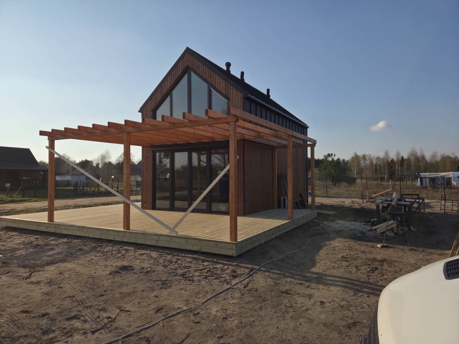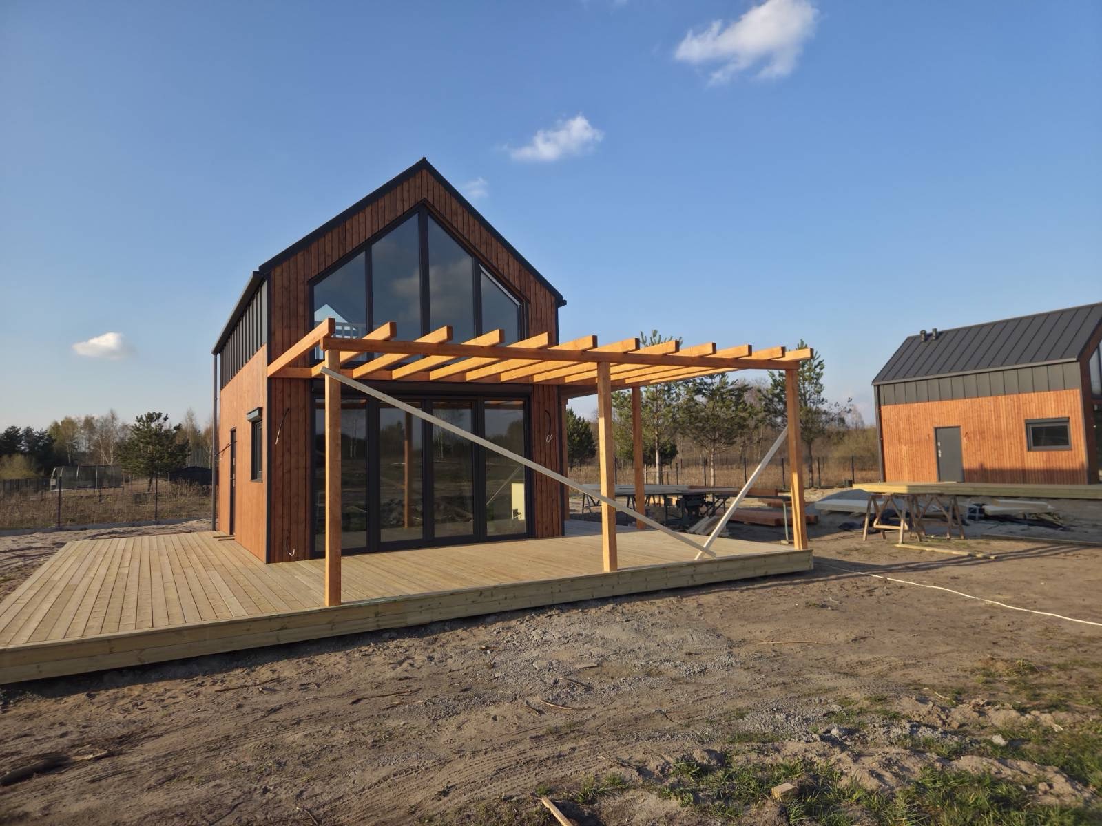 Naturalnym przedłużeniem przestrzeni jest taras, który pozwala żyć bliżej natury — od porannej kawy po wieczorny odpoczynek. To dom, który mimo kompaktowej formy daje poczucie przestrzeni i swobody. Idealny jako pierwszy dom, drugi dom nad jeziorem lub inwestycja pod wynajem.