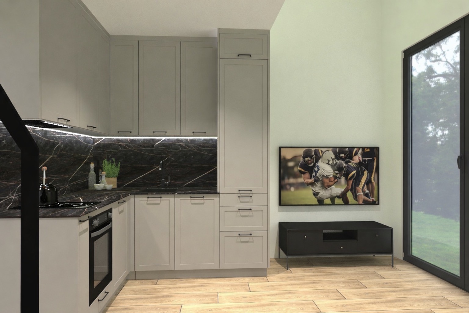 Otwarta strefa dzienna z salonem i kuchnią, dodatkowa sypialnia oraz przestrzeń na antresoli tworzą funkcjonalny układ, który sprawdzi się zarówno na co dzień, jak i podczas weekendowego wypoczynku. Duże przeszklenia wypełniają wnętrze światłem i otwierają dom na otoczenie natury.