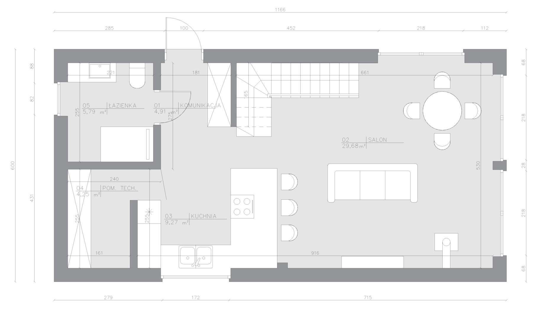 Duże przeszklenia otwierają dom na otoczenie i wypełniają wnętrze naturalnym światłem, a otwarta strefa dzienna tworzy przestrzeń do życia, spotkań i odpoczynku. To projekt, który maksymalnie wykorzystuje każdy metr, oferując realną wygodę w nowoczesnej formie. To dom dla tych, którzy chcą czegoś więcej niż weekendowego azylu — miejsca do życia, które sprawdza się przez cały rok.