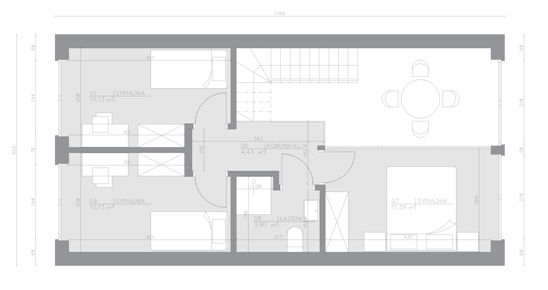 Na kompaktowej powierzchni zabudowy zyskujesz aż trzy sypialnie, dwie łazienki, przestronny salon z aneksem kuchennym oraz dodatkowe pomieszczenia, takie jak garderoba czy strefa techniczna. To układ, który pozwala komfortowo mieszkać nawet kilku osobom bez poczucia ograniczonej przestrzeni.